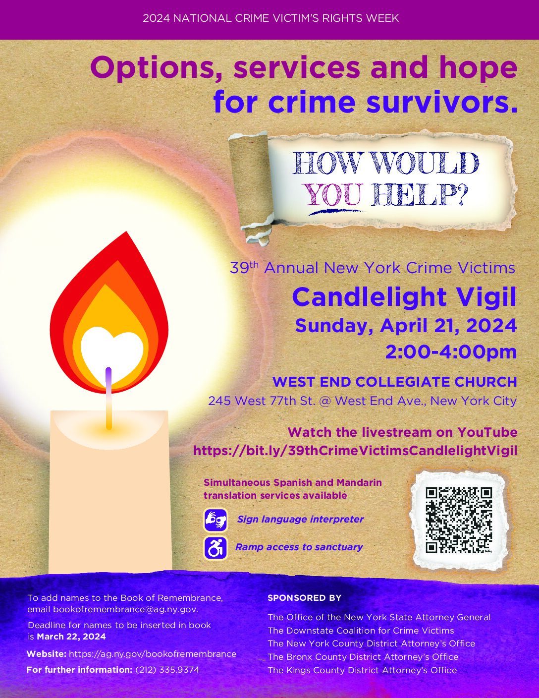 The 39th Annual NYC Crime Victims Candlelight Vigil will be a hybrid event. While we’re back in person this year at West End Collegiate Church on the Upper West Side, we are also continuing our new tradition of virtual celebration by live-streaming the event!
